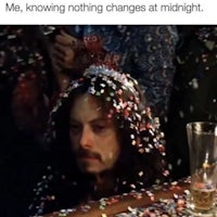 While everyone else is screaming about fresh starts, this guy already knows the truth: it’s still you, just louder and wearing sequins.