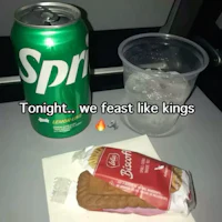 4. Sprite, airplane cup of ice, Biscoff: “Tonight… we feast like kings.”